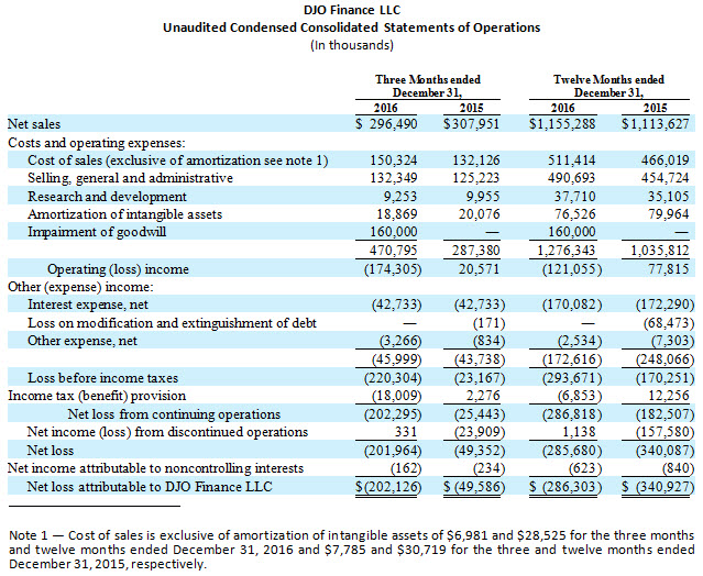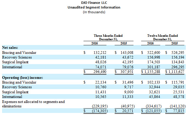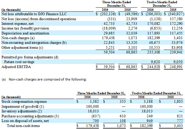 For the fourth quarter of 2016, DJOFL reported a GAAP net loss attributable to DJOFL of $202.1 million, compared to a net loss of $49.6 million for the fourth quarter of 2015. The increase in the net loss was due primarily to impairments of goodwill of $160.0 million related to the Company’s CMF and Vascular businesses, as well as non-cash reserve adjustments of $18.0 million primarily related to changes in inventory methodology as part of the business transformation. For the twelve months of 2016, DJOFL reported a net loss attributable to DJOFL of $286.3 million, compared to a net loss attributable to DJOFL of $340.9 million for the twelve months of 2015. As detailed in the attached financial tables, the results for the current and prior fourth quarter and twelve month periods were impacted by significant non-cash items, non-recurring items and other adjustments.