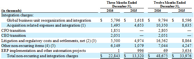 (2) For the twelve months ended December 31, 2016, litigation and regulatory costs consisted of $2.6 million in litigation costs related to ongoing product liability issues and $14.0 million related to other litigation and regulatory costs and settlements.