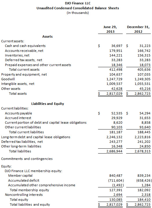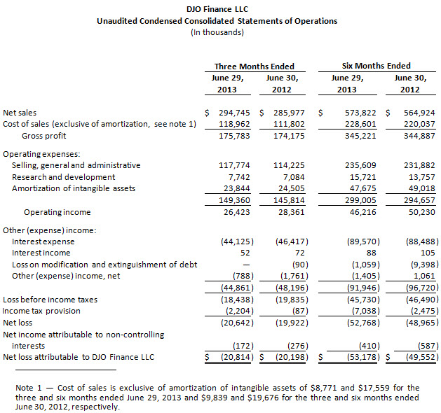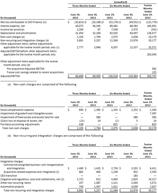 For the second quarter of 2013, DJOFL reported a net loss attributable to DJOFL of $20.8 million, compared to a net loss of $20.2 million for the second quarter of 2012. As detailed in the attached financial tables, the results for the current and prior year second quarter periods were impacted by significant non-cash items, non-recurring items and other adjustments.
