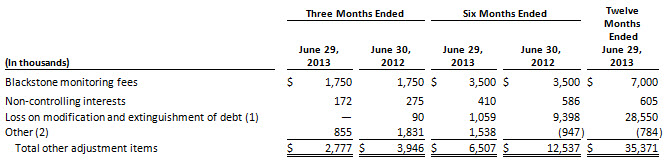 (1) Loss on modification and extinguishment of debt for the six months ending June 29, 2013 consists of $0.9 million in arrangement and amendment fees and other fees and expenses incurred in connection with the amendment of our senior secured credit facilities and $0.2 million related to the non-cash write off of unamortized debt issuance costs and original issue discount associated with term loans which were extinguished. Loss on modification and extinguishment of debt for the twelve months ending June 29, 2013 consists of the preceding amounts and $17.2 million in premiums related to the repurchase or redemption of our 10.875% Senior Secured Notes (“10.875% Notes”), $12.7 million related to the non-cash write off of unamortized debt issuance costs related to the 10.875% Notes and $0.1 million in legal and other fees, net of $2.5 million related to the non-cash write off of unamortized original issue premium associated with the 10.875% Notes. Loss on modification and extinguishment of debt for the six months ending June 29, 2012 consists of $8.6 million of arrangement and amendment fees and other fees and expenses incurred in connection with the March 2012 amendment of our Senior Secured Credit Facility and $0.8 million related to the non-cash write off of unamortized debt issuance costs and original issue discount associated with a portion of our term loans which were extinguished.
