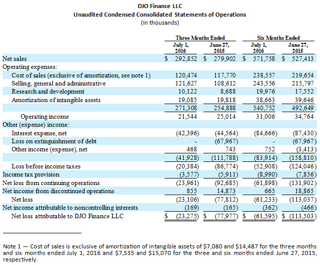 DJOFL achieved net sales for the second quarter of 2016 of $292.9 million, reflecting growth of 4.6%, compared with net sales of $279.9 million for the second quarter of 2015. Changes in foreign currency exchange rates did not have a material impact on the second quarter results.