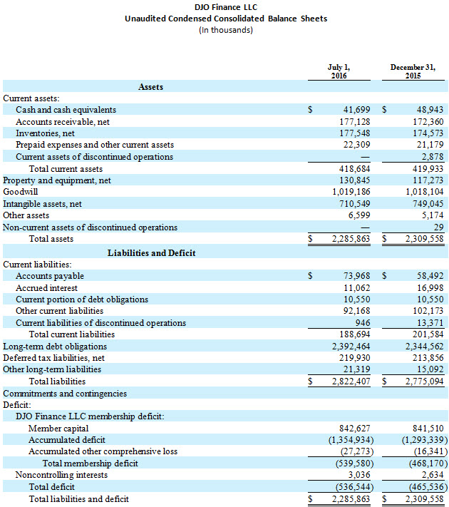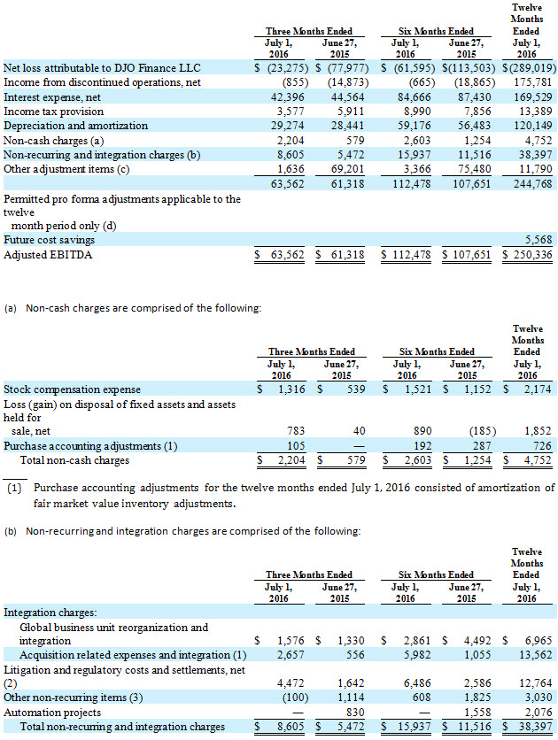 For the second quarter of 2016, DJOFL reported a net loss attributable to DJOFL of $23.3 million, compared to a net loss of $78.0 million for the second quarter of 2015. As detailed in the attached financial tables, the results for the current and prior year second quarter periods and the current and prior year six month periods were impacted by significant non-cash items, non-recurring items and other adjustments.