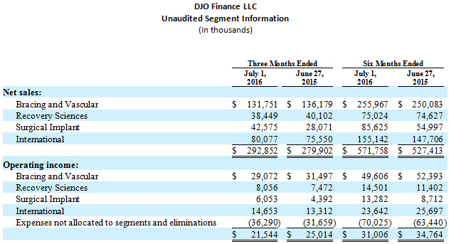 Net sales for DJO’s International segment were $80.1 million in the second quarter of 2016, reflecting an increase of 6.0% from the second quarter of 2015, primarily driven by stronger sales in direct markets, especially in France, Canada, Italy, Spain and Australia, and increased sales penetration in emerging markets.