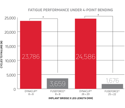 The DynaClip® Bone Fixation System resists implant failure for 6x more loading-unloading cycles than a competitor NiTiNOL staple under cyclic 4-point bending, across all size offerings.1