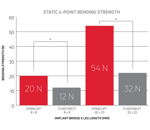 Under static 4-point bending, the DynaClip® Bone Fixation System is at least 66% stronger than a competitor NiTiNOL staple across all size offerings.1